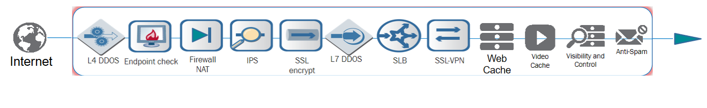 而且為了安全和合規(guī)的要求,往往會在互聯(lián)網(wǎng)出口區(qū)域采用“糖葫蘆串兒”的方式堆積多種安全設(shè)備,類似下面這樣的網(wǎng)絡(luò)部署: